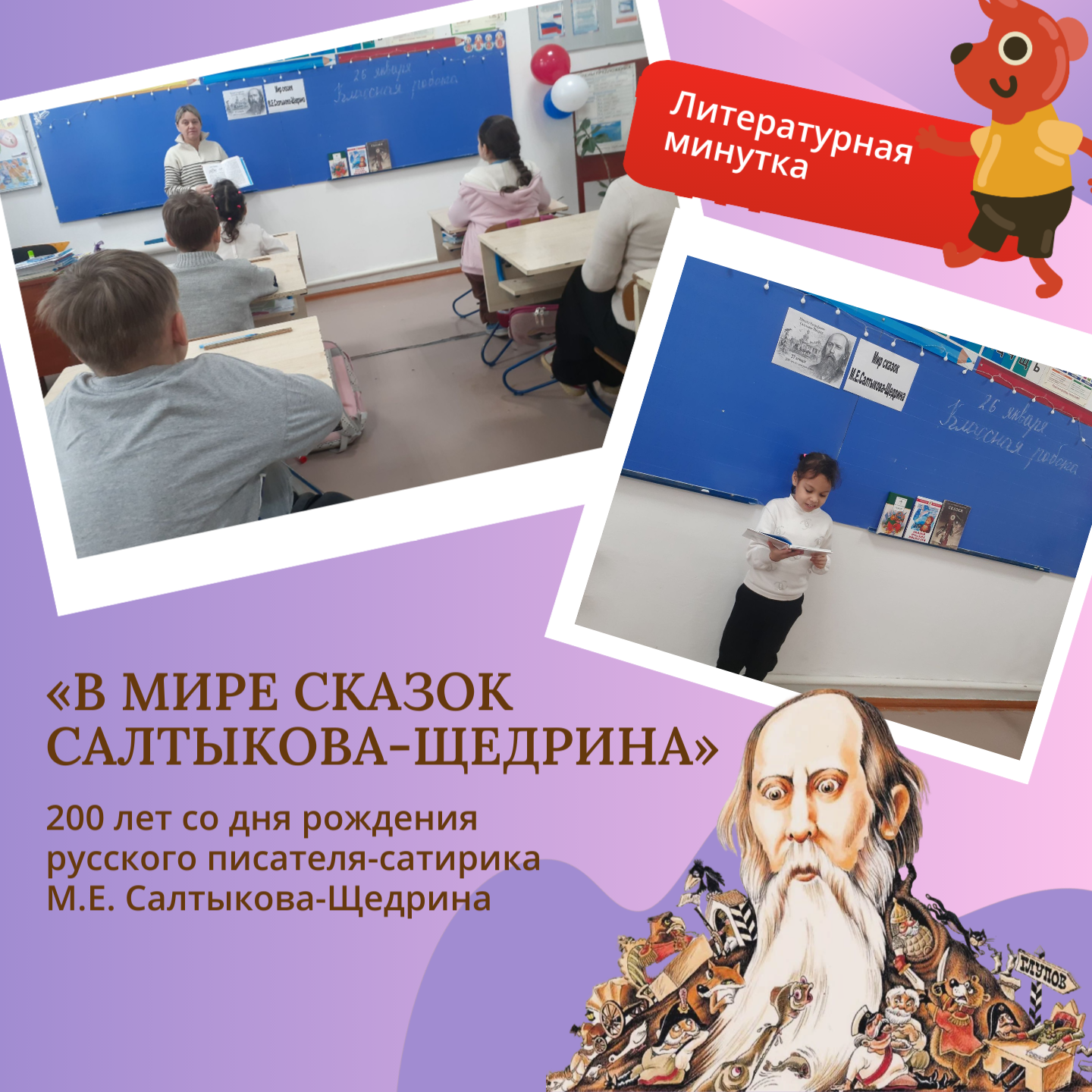 В рамках празднования 200-летия со дня рождения великого русского писателя М.Е. Салтыкова-Щедрина, 27 января, Суворовская сельская библиотека провела для учащихся 3-4 классов Суворовской школы-сада №6 литературную минутку «Мир сказок Салтыкова-Щедрина».