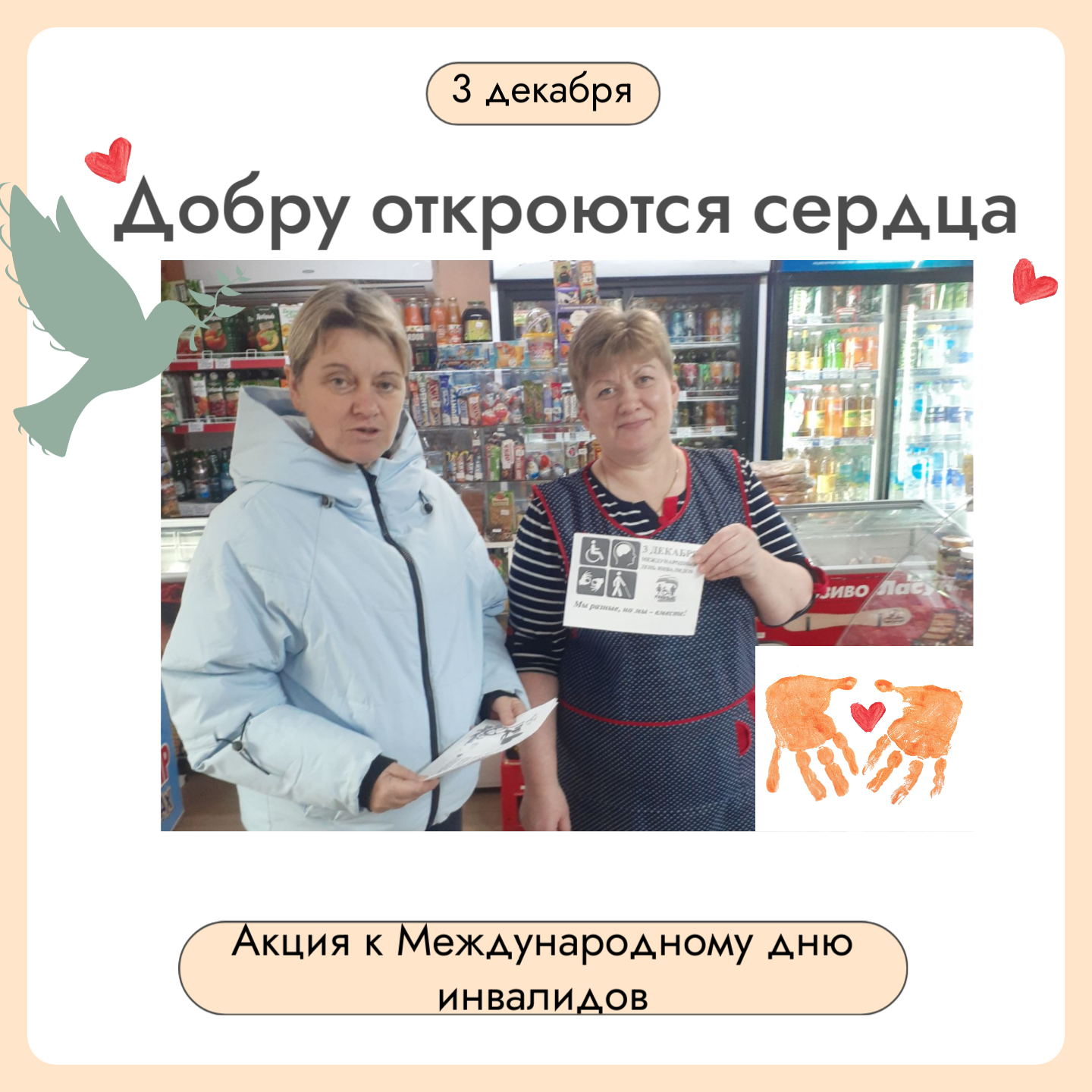 В Международный день инвалидов во многих странах проходят различные акции. Жители села Суворово в этом году присоединились к такой акции. Инициатором проведения акции выступила библиотекарь сельской библиотеки. Цель акции – раздавая листовки, рассказать о проблемах, с которыми сталкиваются люди с ограниченными возможностями здоровья. Подобные мероприятия заставляют задуматься над тем, что нужно помогать всем, кто просит и ждёт нашей помощи. Всем тем, кто обделён вниманием. И важно оказывать поддержку не только в этот день, а постоянно, пока есть силы и возможности.